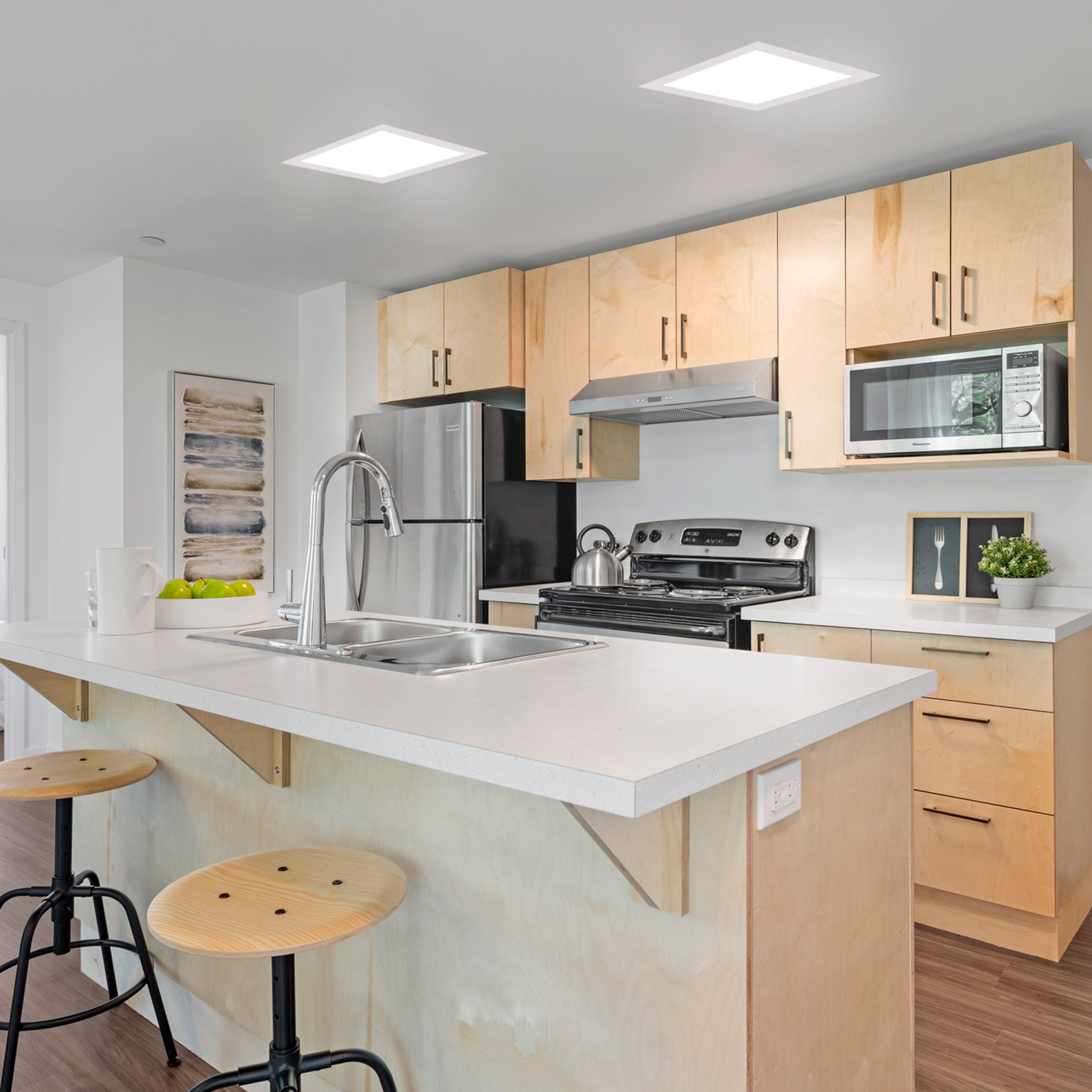 Foco de embutir quadrado da série INTEGO 2.0 PC em cor branca, com as seguintes medidas C.17,5xL.17,5xAlt.2,5 centímetros. A sua luz tem uma potência de 12W, 1200lm e 4000K. Esta cor de luz é aconselhada para salas de estar, áreas de refeição, cozinhas, escritórios e similares.