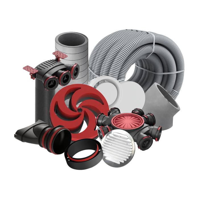 Graças ao uso de tubos ondulados flexíveis, a distribuição dos dutos de ventilação é simples e não requer o uso de acessórios adicionais.