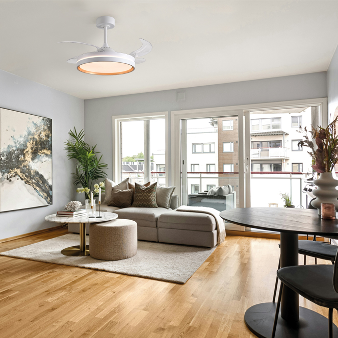 Ventoinha de tecto AKRAN com luz, 4 palas retráteis transparentes e motor DC com 6 velocidades.